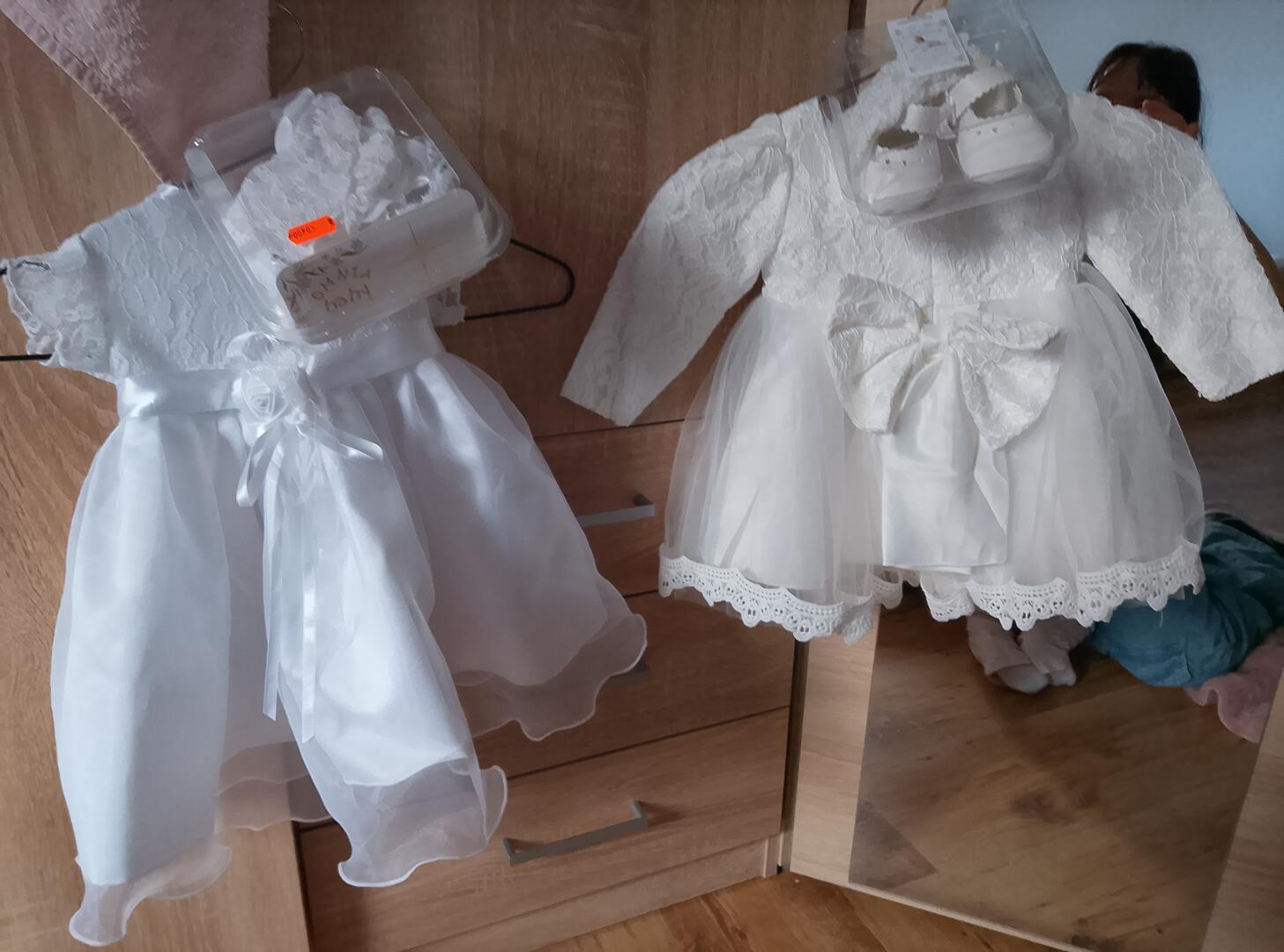 Sprzedam 2 sukienki do chrztu jedna na 2 miesiące druga na 6 miesięcy jedna nieużywana wcale druga położona tylko raz cały zestaw czapeczki i buciki w komplecie 100 zł za 1