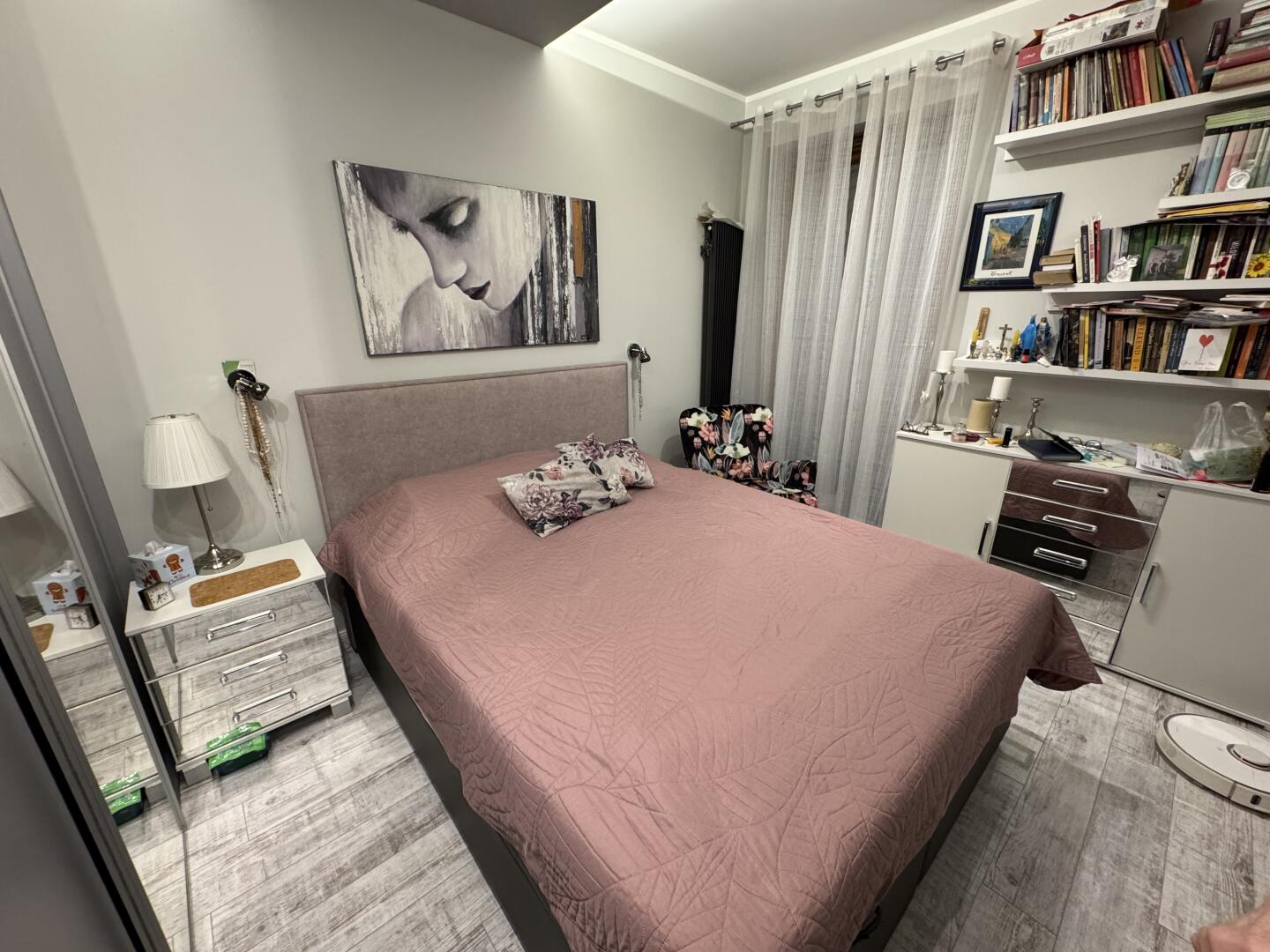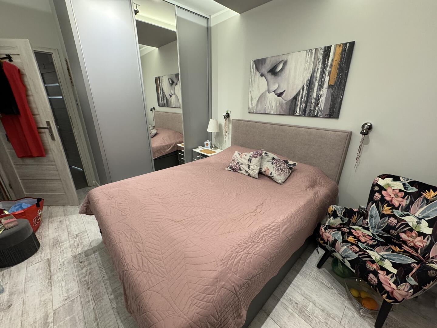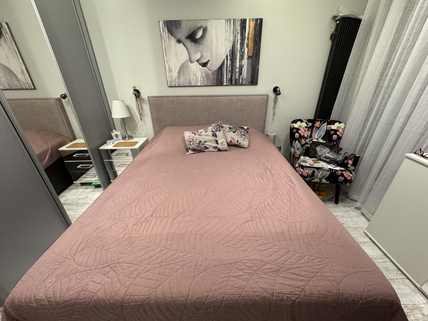 Używane łóżko do sypialni w kolorze różowym. Posiada wezgłowie tapicerowane tkaniną w kwiatowy wzór. Łóżko jest w dobrym stanie technicznym i gotowe do użytku. Wymiary 160x200 nowy materac i nowy zagłówek.
