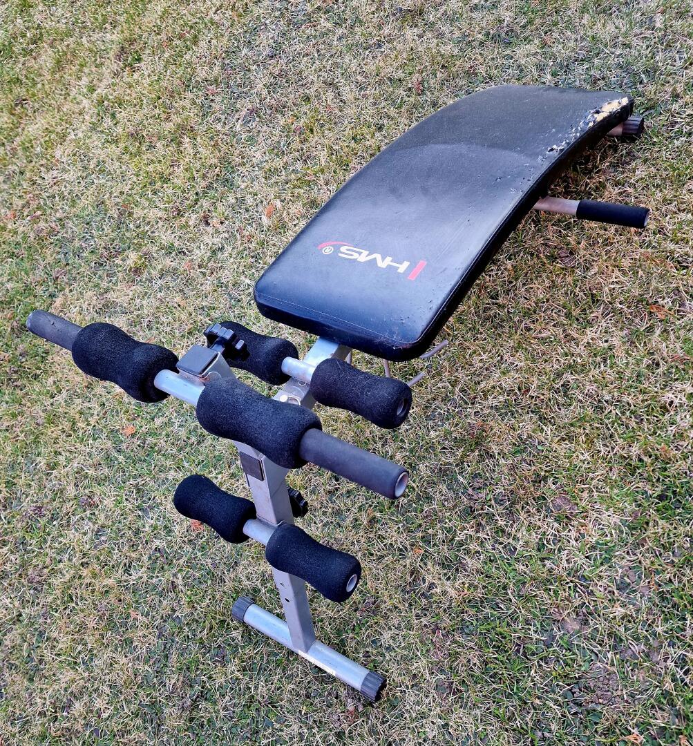 Regulowana ławka skośna do ćwiczeń mięśni brzucha HMS. Stan obicia jak na zdjęciach, niestety kot się do niego dobrał...
