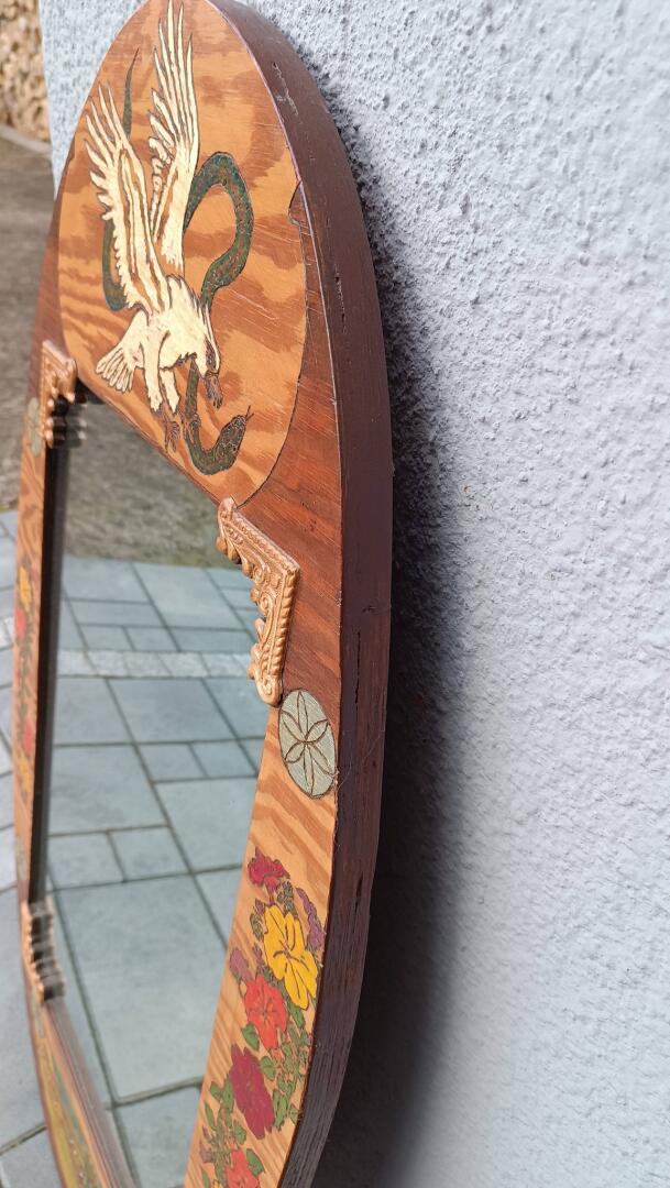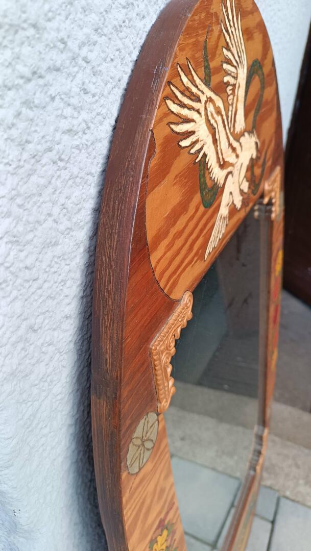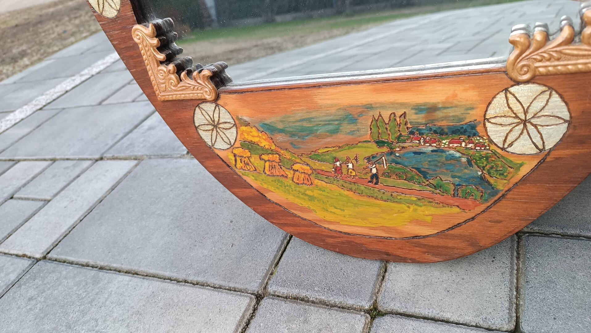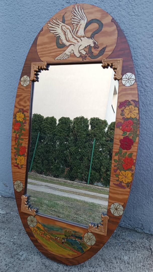 Lustro w ozdobnej ramie wykonanej z płyty, zdobione ręcznie techniką wypalania oraz malowania. Wymiary to 96 cm wysokości i 51 cm szerokości. Rama posiada bogate, artystyczne zdobienia. Górną część dekoruje dynamiczny motyw orła w locie z wężem, boki zdobią kolorowe kompozycje kwiatowe oraz elementy geometryczne, a na dole znajduje się malowany pejzaż z wiejskim krajobrazem.
