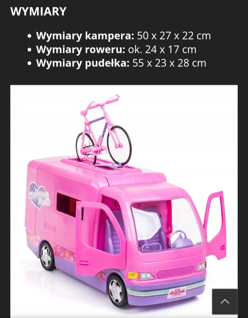 Duży kamper dla lalek barbie z akcesoriami i rower z lalką.